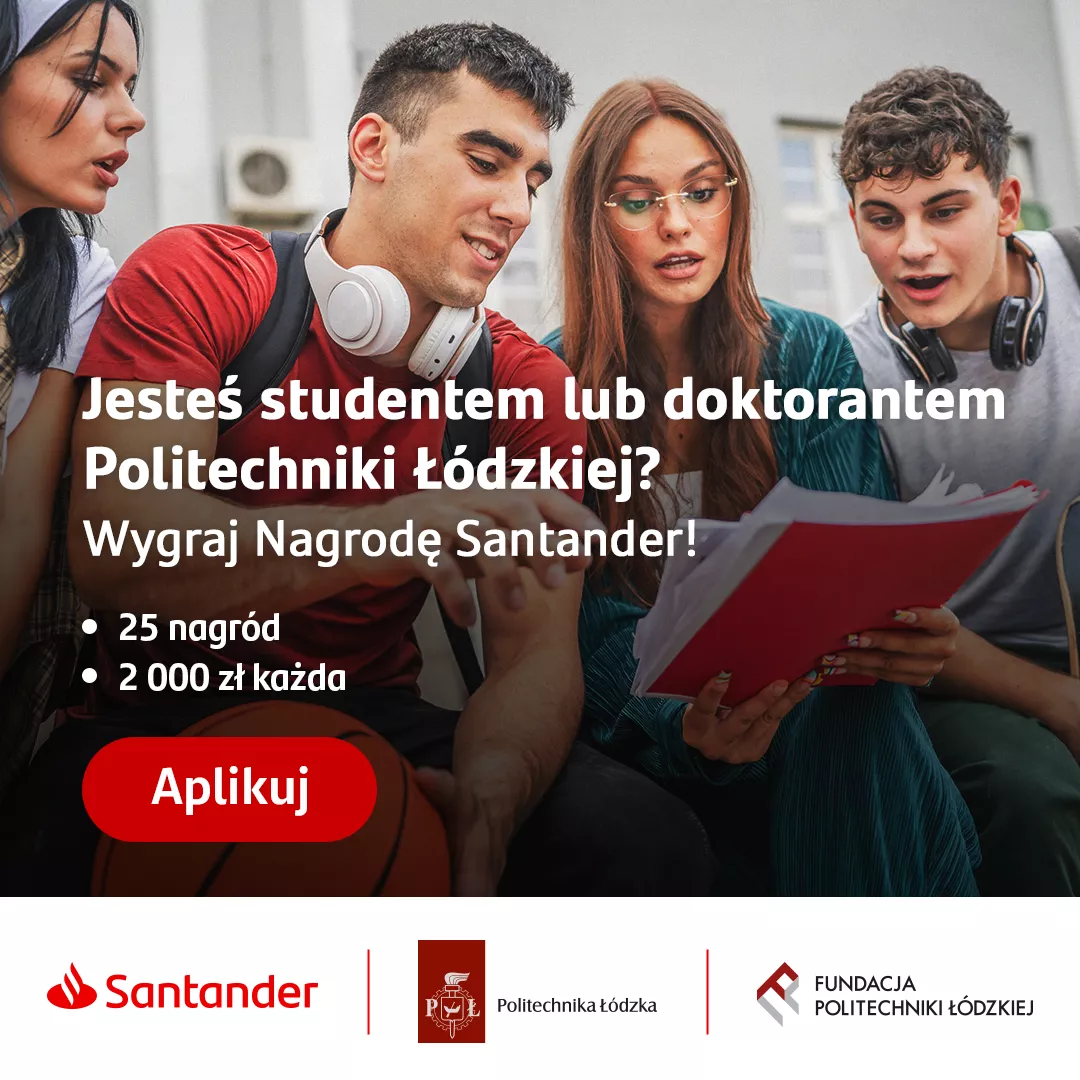 Wyślij aplikację 4 listopada tutaj: https://app.santanderopenacademy.com/pl/program/nagroda-santander-dla-studentow-i-doktorantow-politechniki-lodzkiej-2025