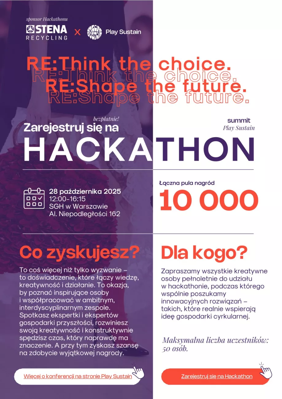 Hackathon odbędzie się 28 października w Szkole Głównej Handlowej w Warszawie. To wyjątkowa inicjatywa, w ramach której 50 uczestników, podzielonych na zespoły, będzie pracować nad kreatywnym rozwiązaniem, które pomoże skutecznie dotrzeć do pokolenia „Z” z przekazem o gospodarce cyrkularnej. Jak sprawić, by nasze codzienne decyzje - w tym świadome wybory zakupowe - były podejmowane z troską o środowisko i wspólny dobrostan? Nad tym zastanowią się studenci/tki.