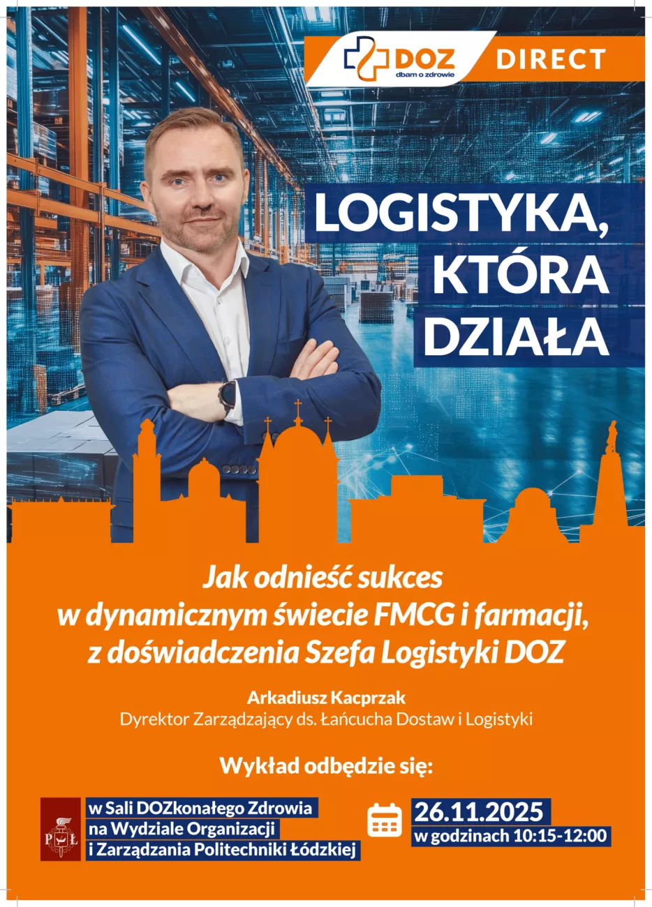 Wykład będzie poprowadzony przez Pana Arkadiusza Kacprzaka Dyrektora Zarządzającego ds. Łańcucha Dostaw i Logistyki w firmie DOZ Direct.